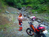 1本目の林道1度通っているので所々の状況はおもいだしながら、進めます。それに昨夜このあたりは夕立が降ったとかで路面コンディションも許容範囲内?全く未知の昨年とはビビリ具合が違います。 し・し・し・しかし、例の場所だけはやはり代走、仕方ありません この坂、傾斜に下はガケのカーブ、ぶるぶるですわ!! おかげさんで、何とか転倒なしで無事出発点に戻ることができ 新たに道を探します・・・ 時間はたっぷりあるので。。。 店長さんの元気は続きます ![]() そして、2本目の林道は トガサワラ原始林道へ続く道です 初めて見たエコトイレにびっくり!!全くにおわ無ーいんです。 おがくずのようなものに紛れて分解されてしまうらしいです。 一やすみしてから、 ここもかなり高く登って行きます。林業の為の道なのね。 途中で作業ユンボに出会い、Uターン 5キロ×2の旅でした。 3本目の林道とは、 またまた、振り出しに戻ってお次は〜何処までいくんですか〜? と言うくらいの ここいらでは珍しいロングな林道でございました。 測るところ12K。往復24キロでしっかり、フラ〜ット。楽しんできやした。 アーこれで、帰れる〜!!(店長さんには思い残す事が1個だけあったようですが) わたくしは、思い残すことなく、169を早く帰りたい一身で走っていましたよぉ〜 がが、、、突然の夕立に見舞われ か〜ん一発で見つけたバス停に滑り込んだのです そのあと 立ちごけ〜でございます 自力では起こす力も残ってなく、シェルパちゃんはシャワーを浴びてきれいになりましたとさ。。。 走行距離 250キロ |